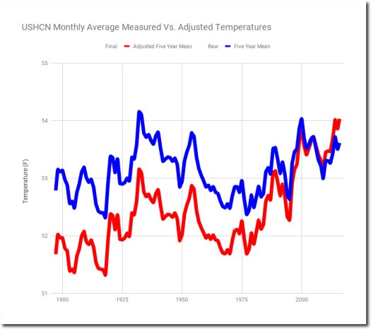 La linea blu in basso mostra la media quinquennale della temperatura media annuale in tutte le stazioni della rete di climatologia storica degli Stati Uniti NOAA. La linea rossa mostra il grafico che rilasciano al pubblico, che è stato fortemente alterato per creare l’aspetto del riscaldamento, che non esiste nei dati del termometro.