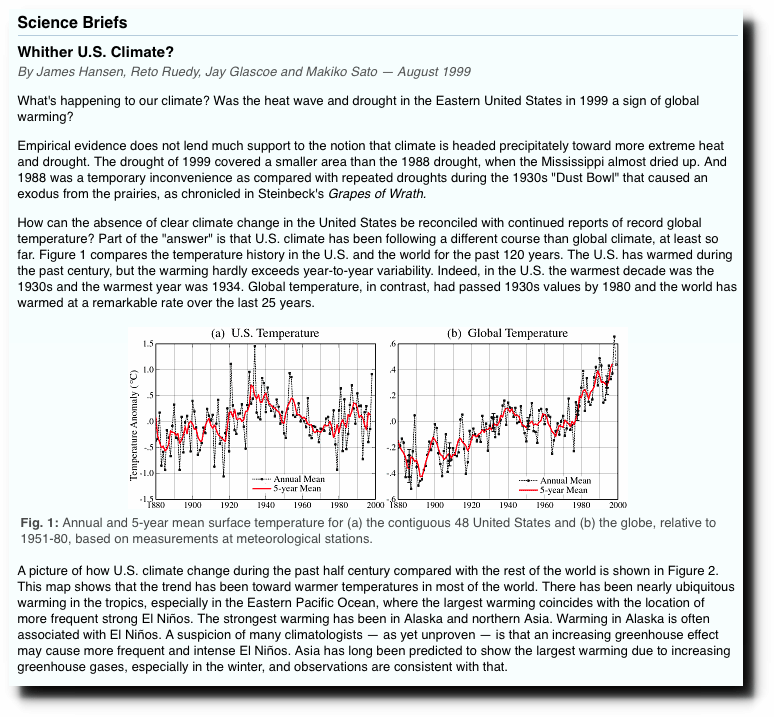 E nel 1999, i dati sulla temperatura degli Stati Uniti di Hansen (grafico in basso a sinistra) hanno mostrato un raffreddamento dagli anni ’40.