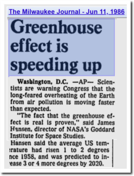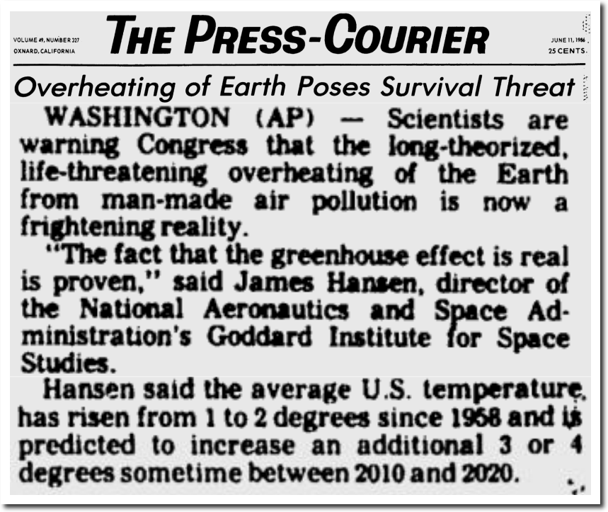 Nel 1986, il principale scienziato del clima della NASA, James Hansen, predisse che gli Stati Uniti si sarebbero riscaldati di 4-6 gradi entro il 2020 (l’anno prossimo).