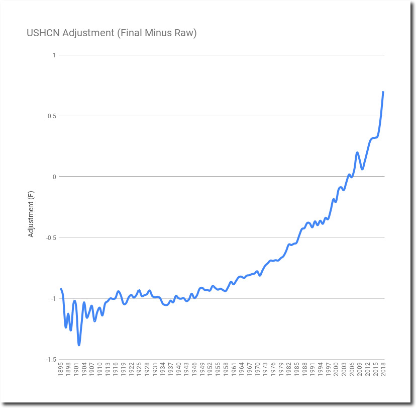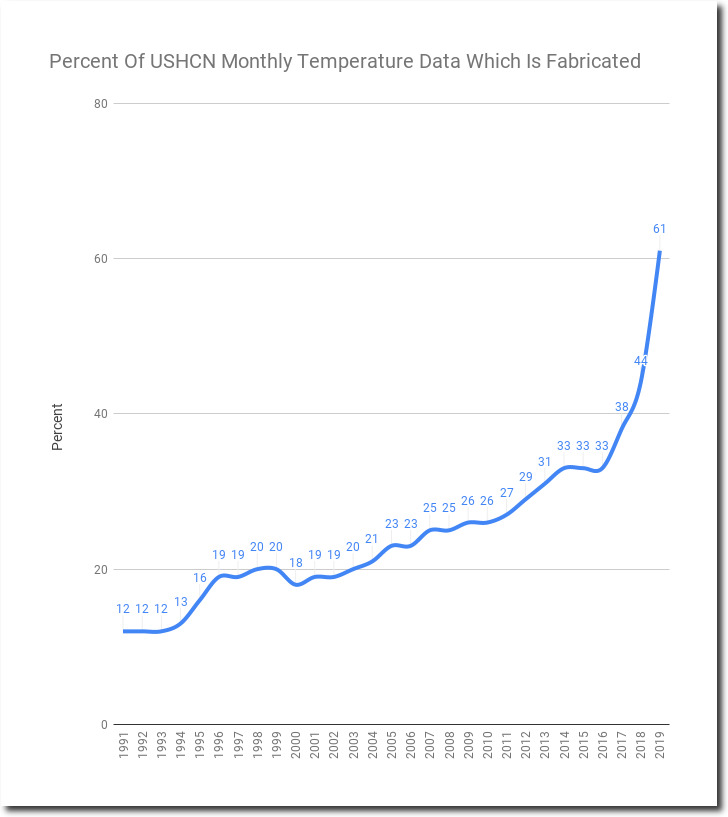 La maggior parte delle recenti manomissioni dei dati è stata dovuta semplicemente alla creazione di dati. Nei loro dati mensili sulla temperatura, contrassegnano le temperature stimate (anziché misurate) con la “E” maiuscola. Finora nel 2019, il sessantuno percento dei dati mensili sulla temperatura è ora stimato da un modello computerizzato, piuttosto che dai dati effettivi del termometro misurato. La quantità di dati falsi è aumentata del 500% rispetto a 30 anni fa.