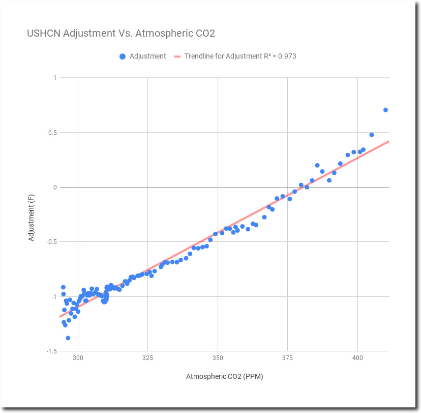 Tracciato con la CO2 atmosferica sull’asse X invece del tempo, diventa evidente che i dati vengono modificati con precisione (R² = 0,97) per corrispondere alla teoria del riscaldamento globale. L’ultima scienza spazzatura.